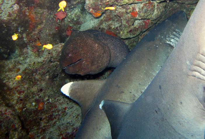 Рифовые акулы, спящие в пещере и гигантская серая мурена